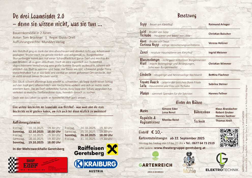 Es freut uns sehr, dass wir euch ab 10. Oktober 2025 unser neues Stück "De drei Loamsieder 2.0 - denn sie wissen nicht, was sie tun" präsentieren dürfen.